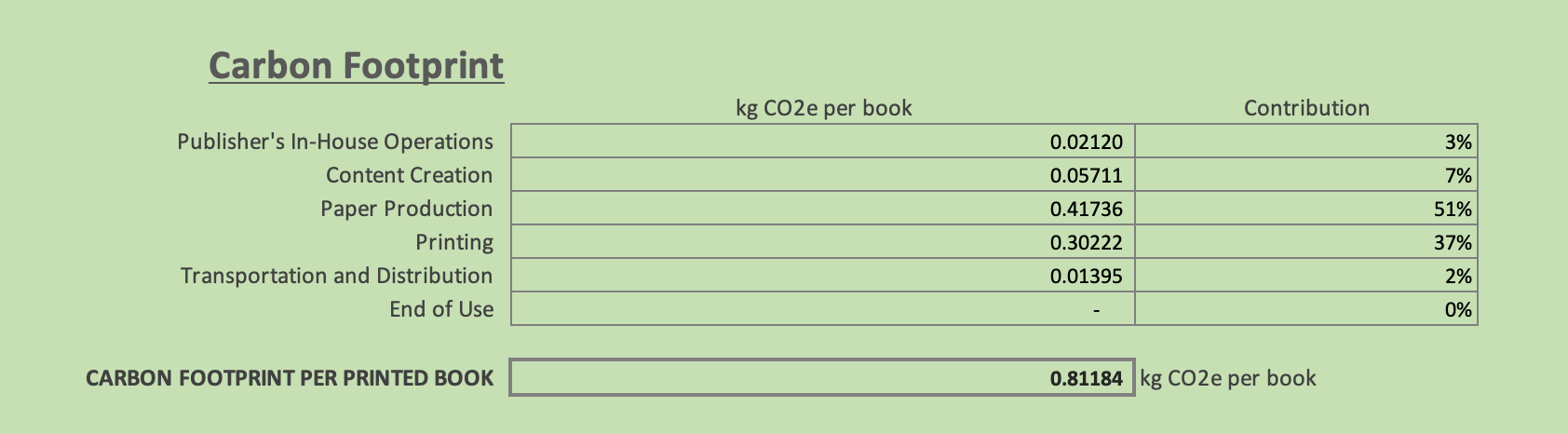 Let me give you the example of a book, because it’s something I have come to know far too much about. Together with my co-conspirator EJ at New Society Publishers, I developed a carbon calculator to sort out this very thing. Here’s the breakdown of emissions for a single 208-page book printed in Canada on 100% post-consumer waste paper: